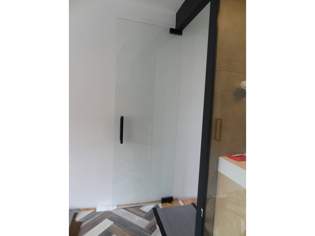 Číre jednokrídlové sklenené kyvné tzv. lietačkové dvere na mieru, vrátane potrebného kovania pre bezrámové osadenie do omietnutého ostenia stavebného otvoru. Krídlo je určené hrúbkou skla, výrezmi a otvormi v skle pre bodové osadenie na rohových kyvných tzv. lietačkových pántoch s ovládaním madlom.