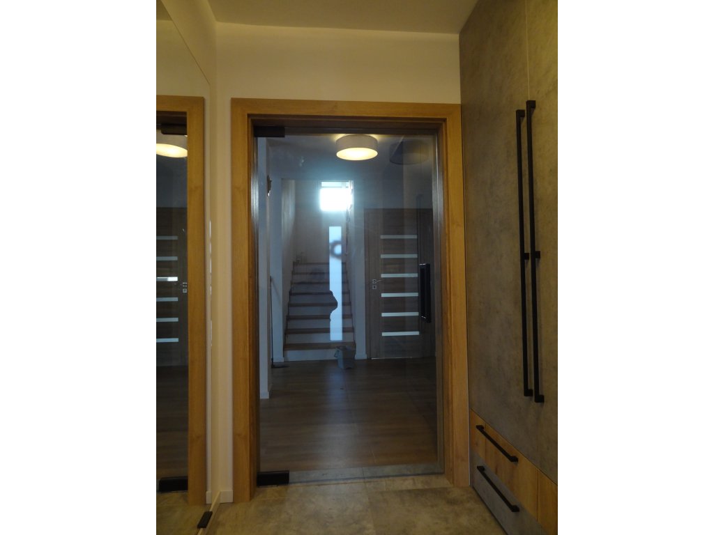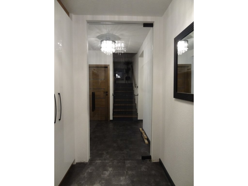 - 1 ks číre sklenené dverné krídlo z kaleného skla hrúbky 10 mm zhotovené v rozmeroch určených pre osadenie do stavebného otvoru podľa konfigurácie produktu.