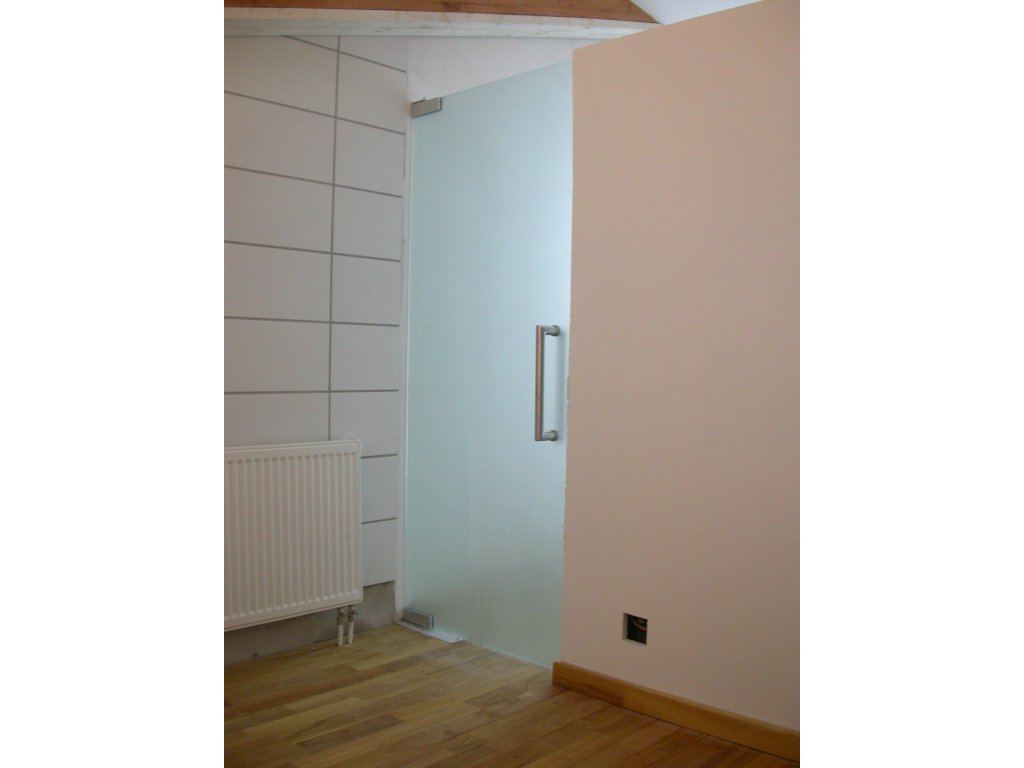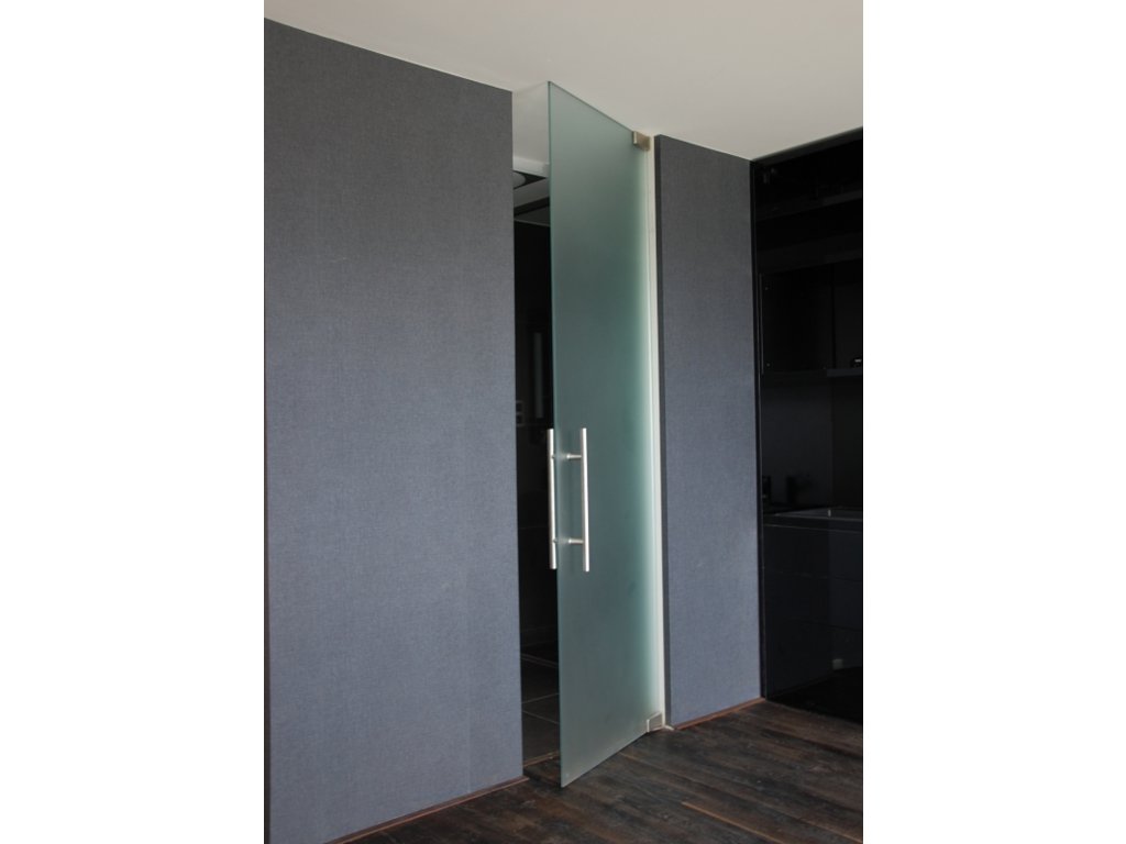 Matné jednokrídlové sklenené kyvné tzv. lietačkové dvere na mieru vrátane potrebného kovania pre bezrámové osadenie do omietnutého ostenia stavebného otvoru. Krídlo je určené hrúbkou skla, výrezmi a otvormi v skle pre bodové osadenie na rohových kyvných tzv. lietačkových pántoch s ovládaním madlom.