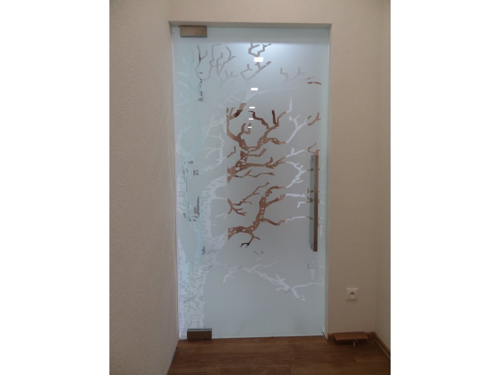 Vzorované jednokrídlové kyvné tzv. lietačkové sklenené dvere na mieru, vrátane potrebného kovania pre bezrámové osadenie do omietnutého ostenia stavebného otvoru. Krídlo je určené hrúbkou skla, výrezmi a otvormi v skle pre bodové osadenie na rohových kyvných tzv. lietačkových pántoch s ovládaním madlom.